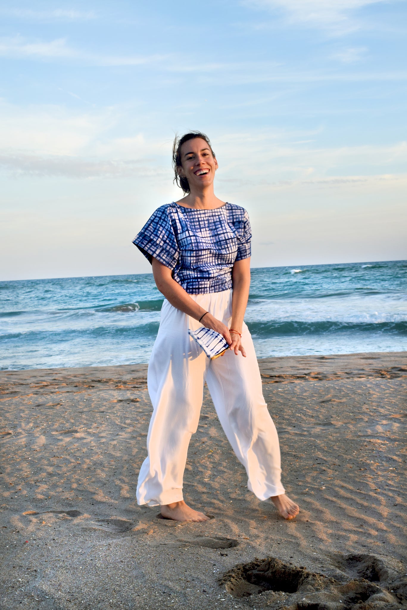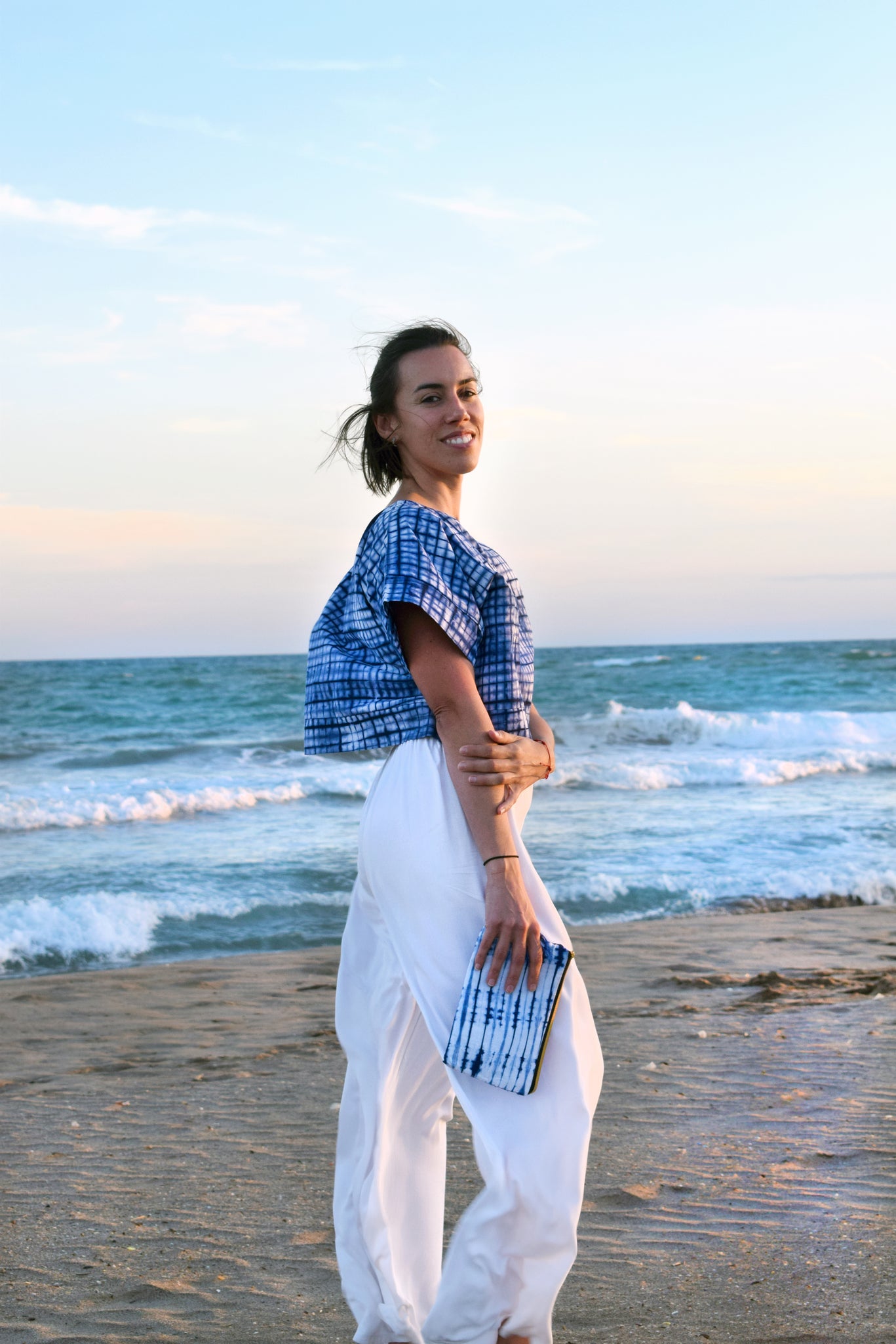 Experience a fusion of global craftsmanship with this striking crop top. Its bold grid pattern is created using a precise accordion-folding technique, inspired by the Japanese Itajime Shibori method. Hand-dyed and sewn by skilled Nigerian artisans, this piece is a testament to authentic textile artistry. Made from airy 100% cotton, it offers a cool, fresh feel for warmer days.